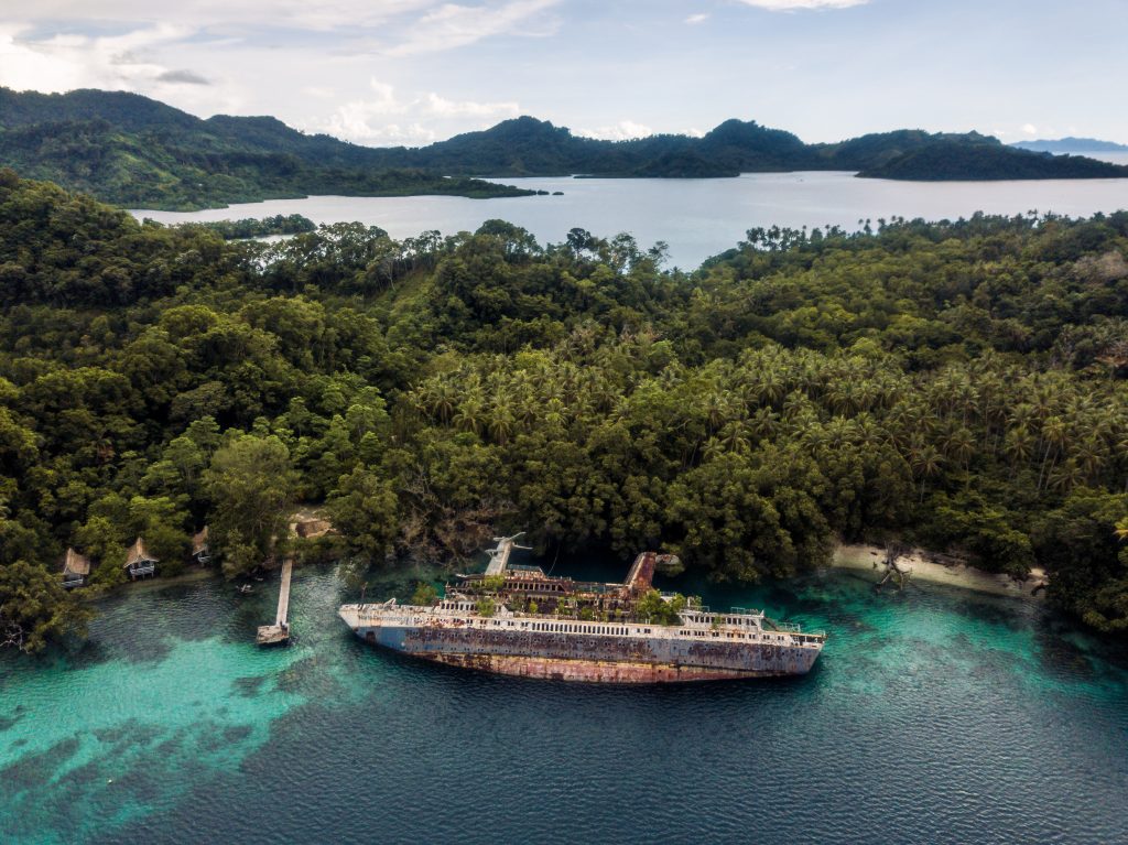World Discoverer is a permanent fixture in this hamlet – the half-sunken ocean liner has been lying, half-submerged and tipped to one side, since 2000 when it fatefully hit an uncharted reef. In the 25 years since, nature has reclaimed it – fish swim through its port holes, trees sprout from its upper deck, barnacles cling to the hull.